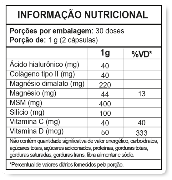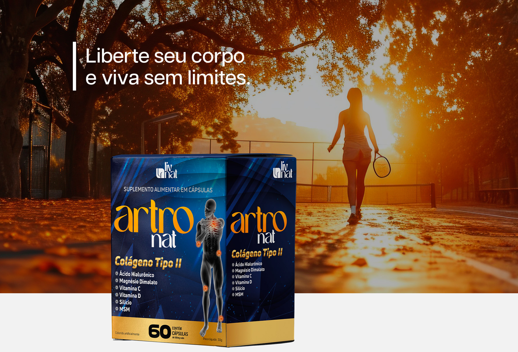 Descrição: ArtroNat é formulado para garantir a saúde das suas articulações, proporcionando mais conforto e mobilidade. Com Colágeno Tipo 2, Ácido Hialurônico, Magnésio Dimalato, Vitaminas C e D, Silício e MSM, ArtroNat oferece um suporte completo para suas articulações.